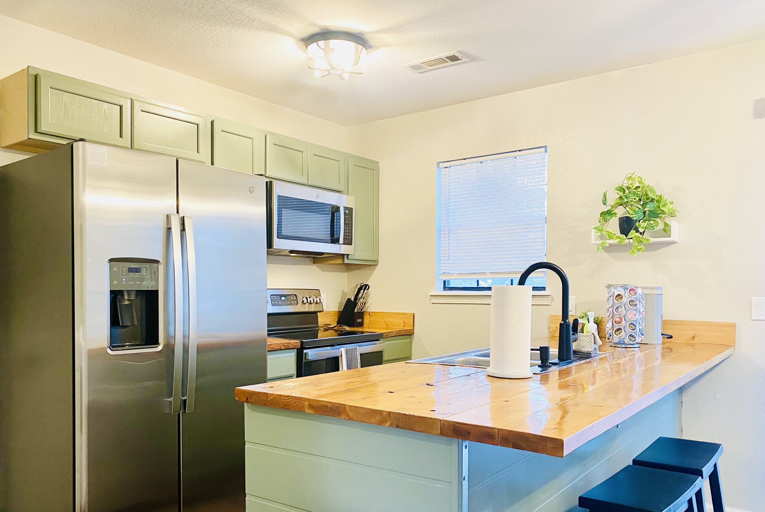 Modern kitchen with stainless steel refrigerator, light green cabinets, black stove and microwave, wooden countertop island, window with blinds, potted plant on wall shelf, paper towel roll, coffee pods, and bar stools.