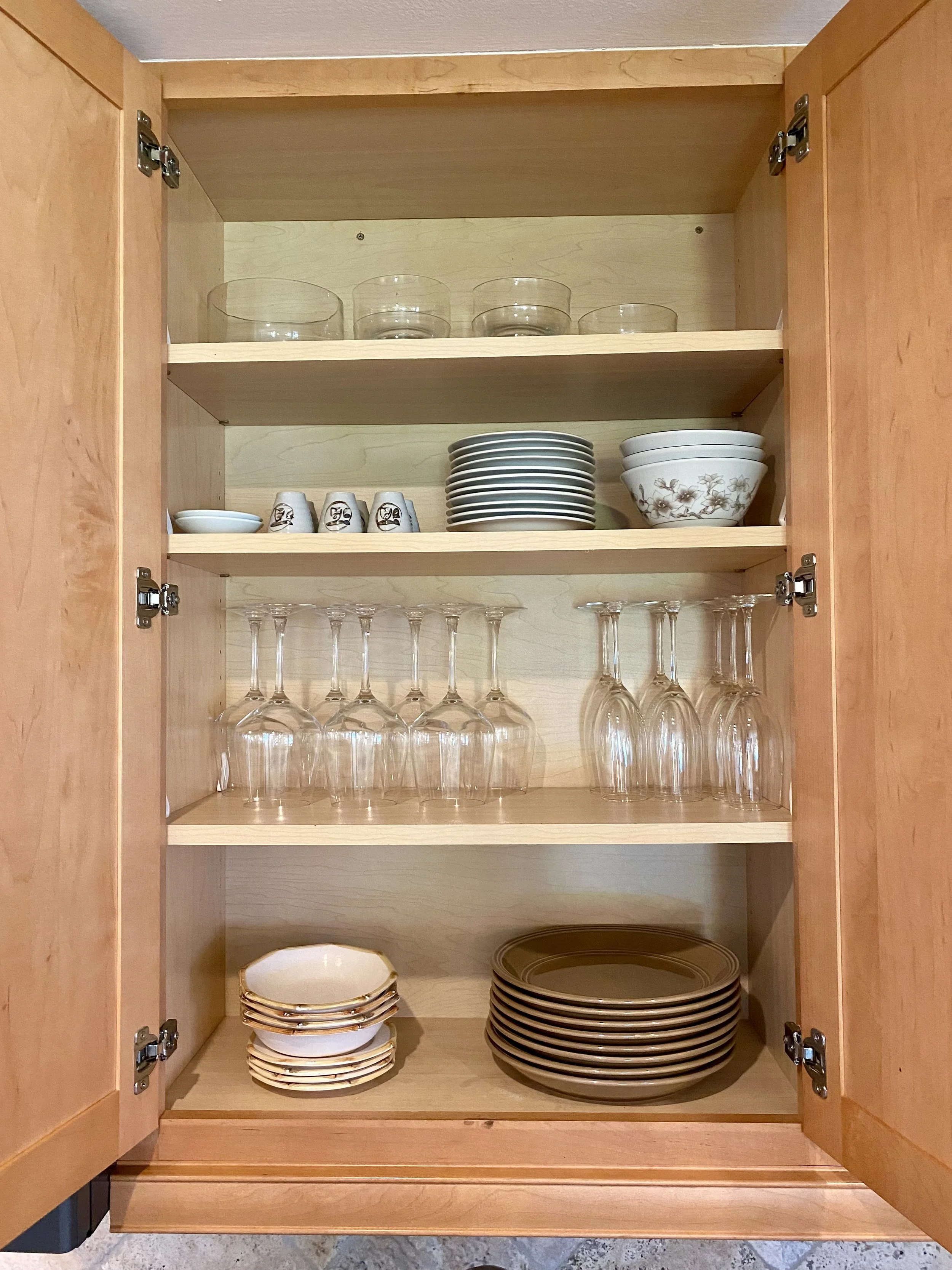 Open wooden cabinet filled with glassware, bowls, and plates. Top shelf has glass bowls, middle shelf has small cups, dinner plates, and bowls, bottom shelf has wine glasses and stacked smaller bowls and larger plates.