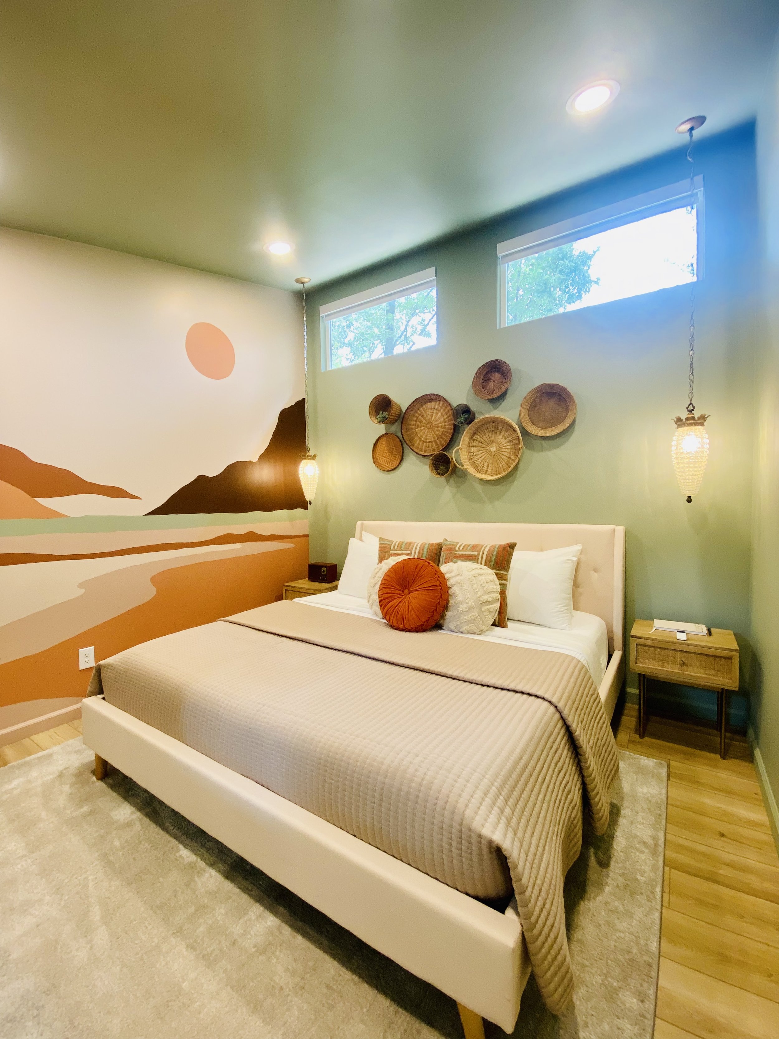 A bedroom with a mural of a mountain landscape on one wall, a bed with beige bedding and decorative pillows, wicker wall art, and hanging pendant lights.