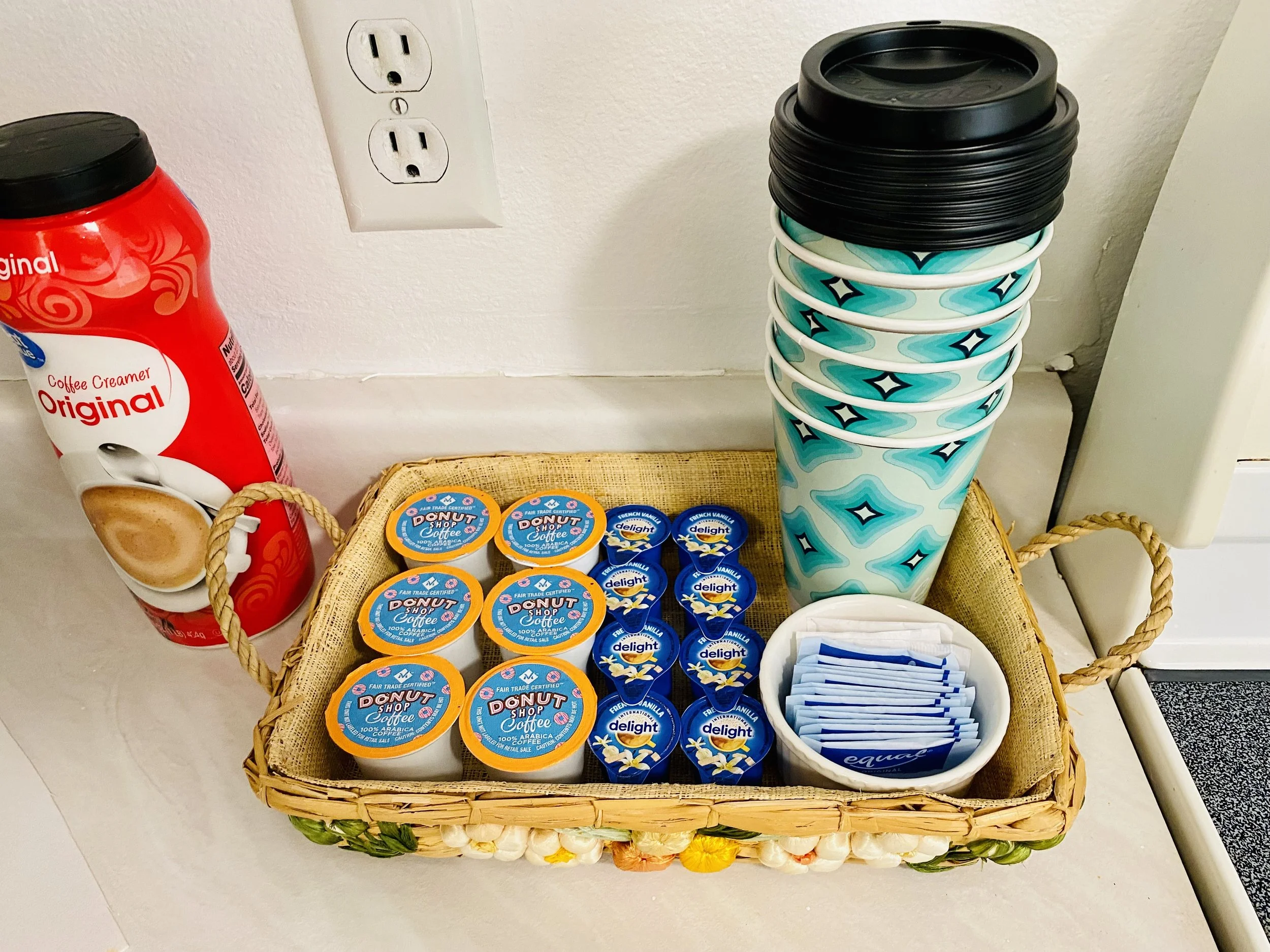 A tray of coffee cups, creamers, sugar packets, and stir sticks next to a stack of disposable cups near an electrical outlet.