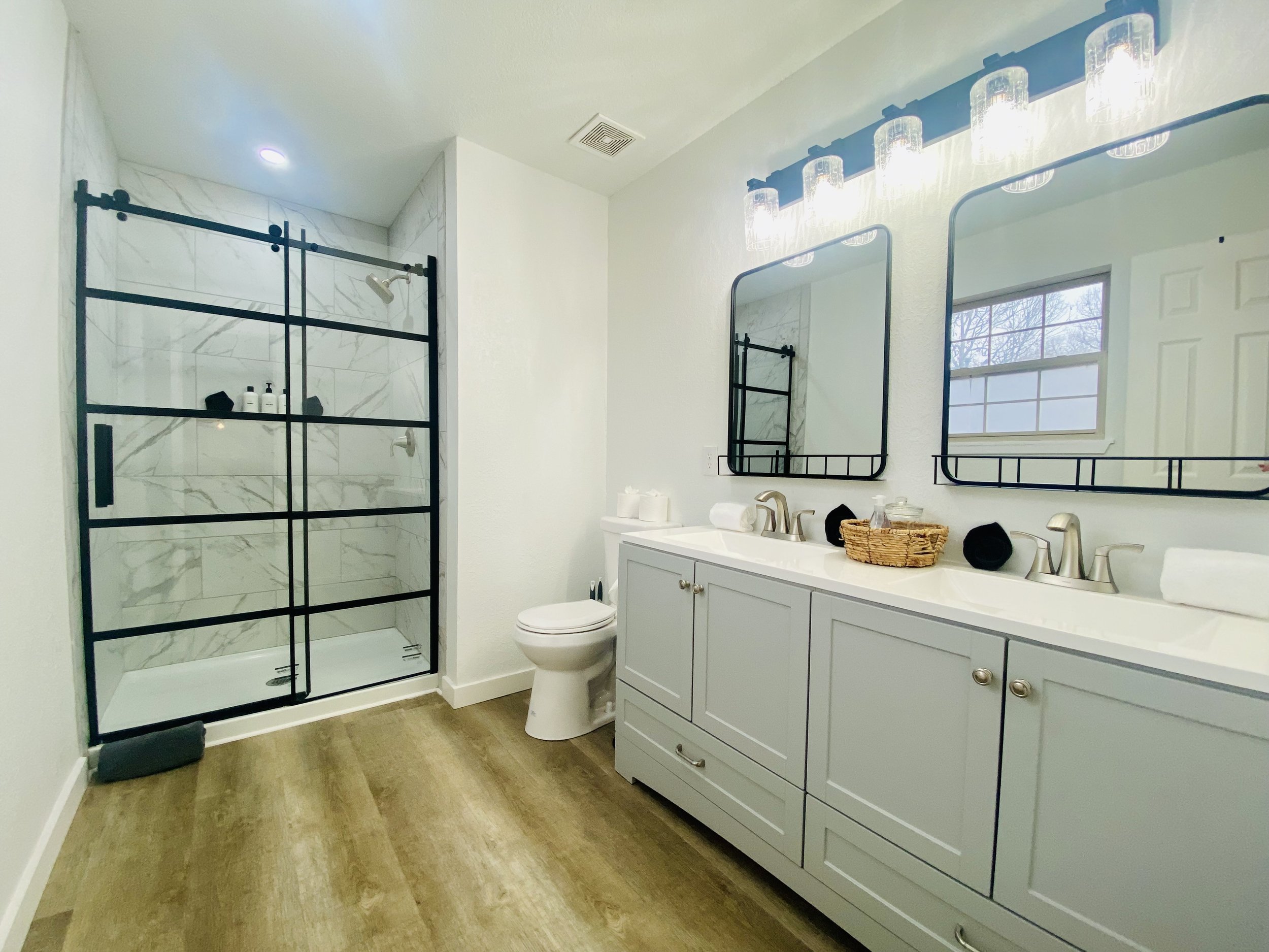 Modern bathroom with a walk-in shower, a toilet, and a double vanity with two mirrors and six light fixtures above the mirrors.