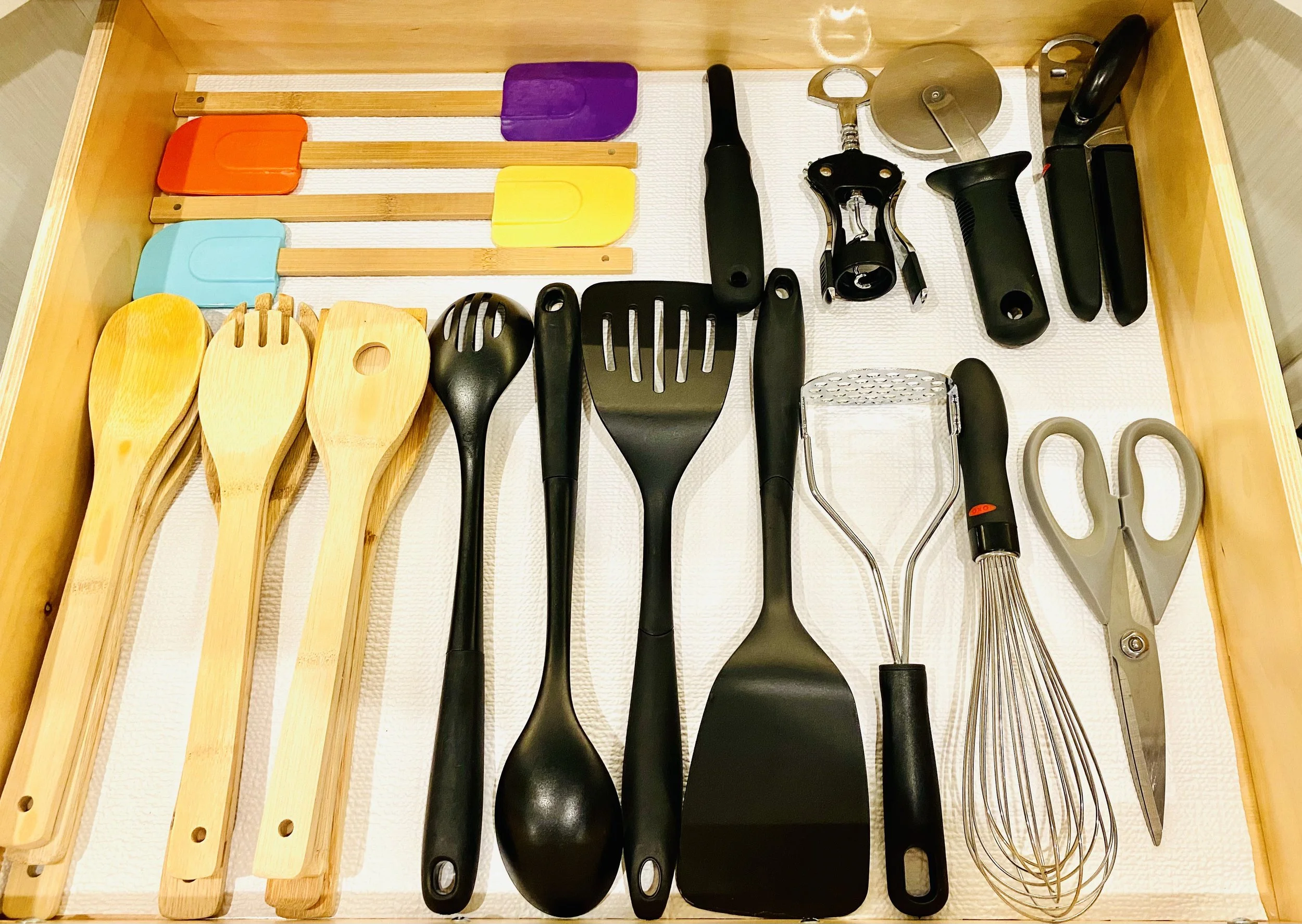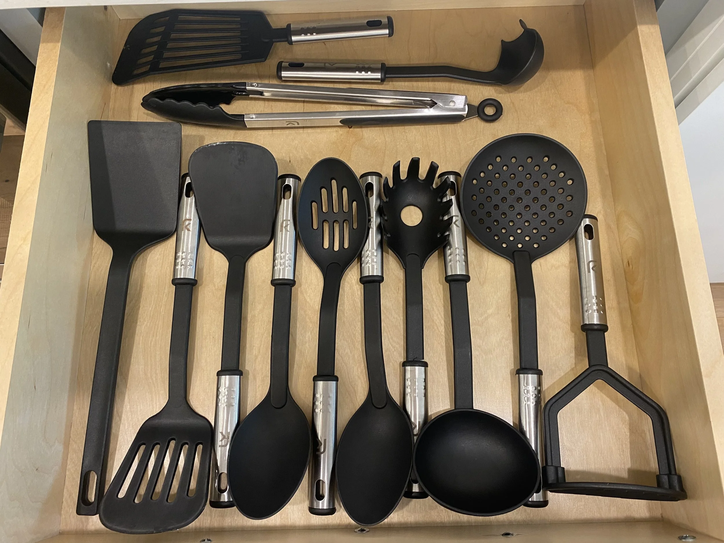 A wooden drawer containing a variety of black and silver kitchen utensils, including spatulas, tongs, a skimmer, and a potato masher.