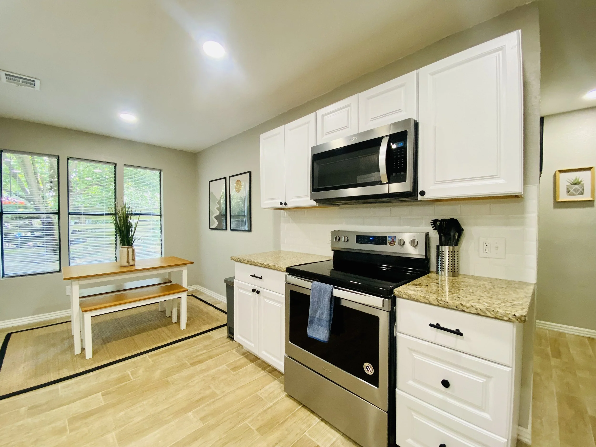 Kitchen with white cabinets, granite countertops, stainless steel appliances, bay window, and a small dining area with a potted plant.