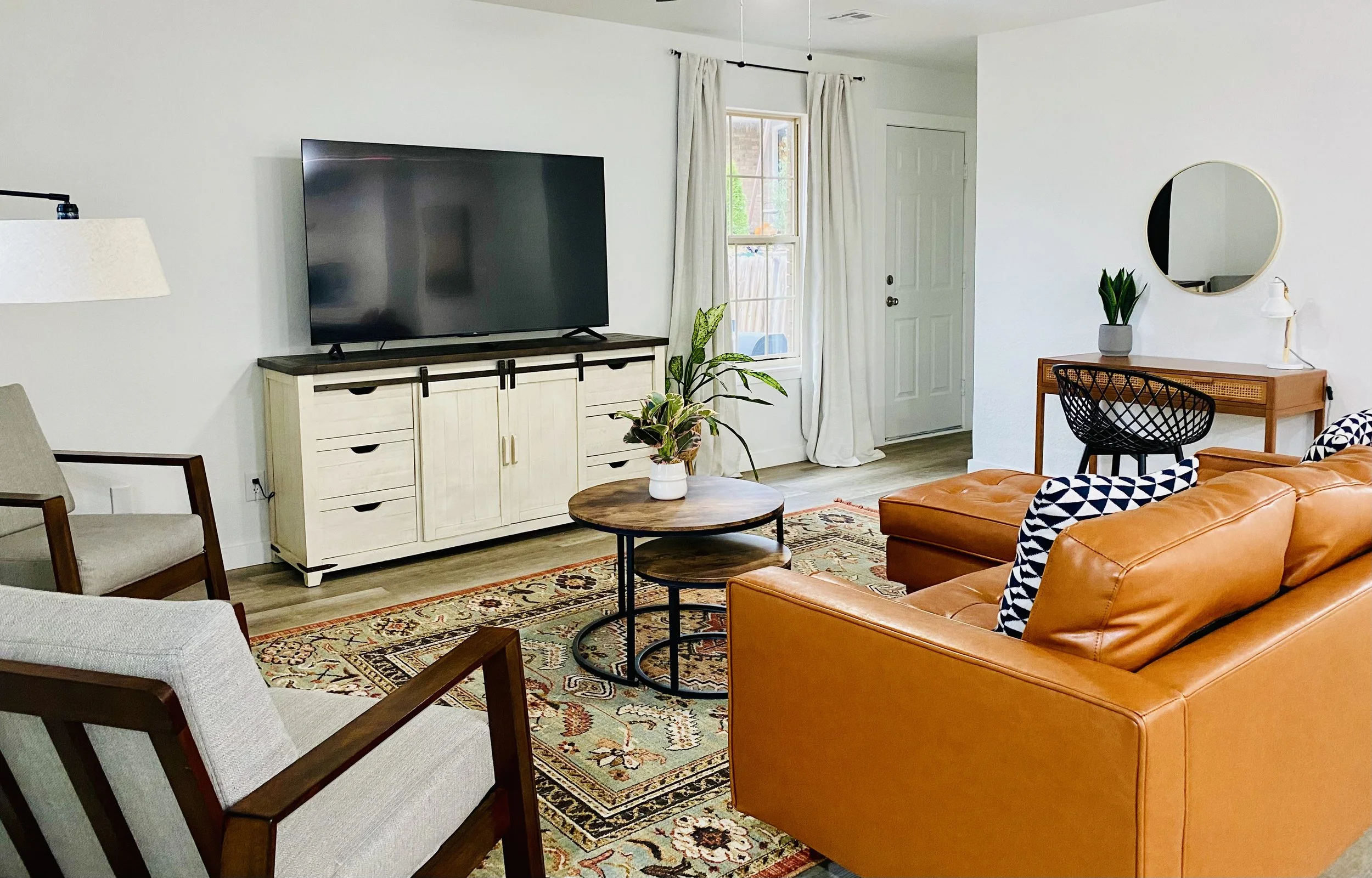 Living room with a sofa, armchair, TV on a white entertainment center, round wooden coffee table with plants, rug, window with curtains, desk with mirror, and decorative pillows.