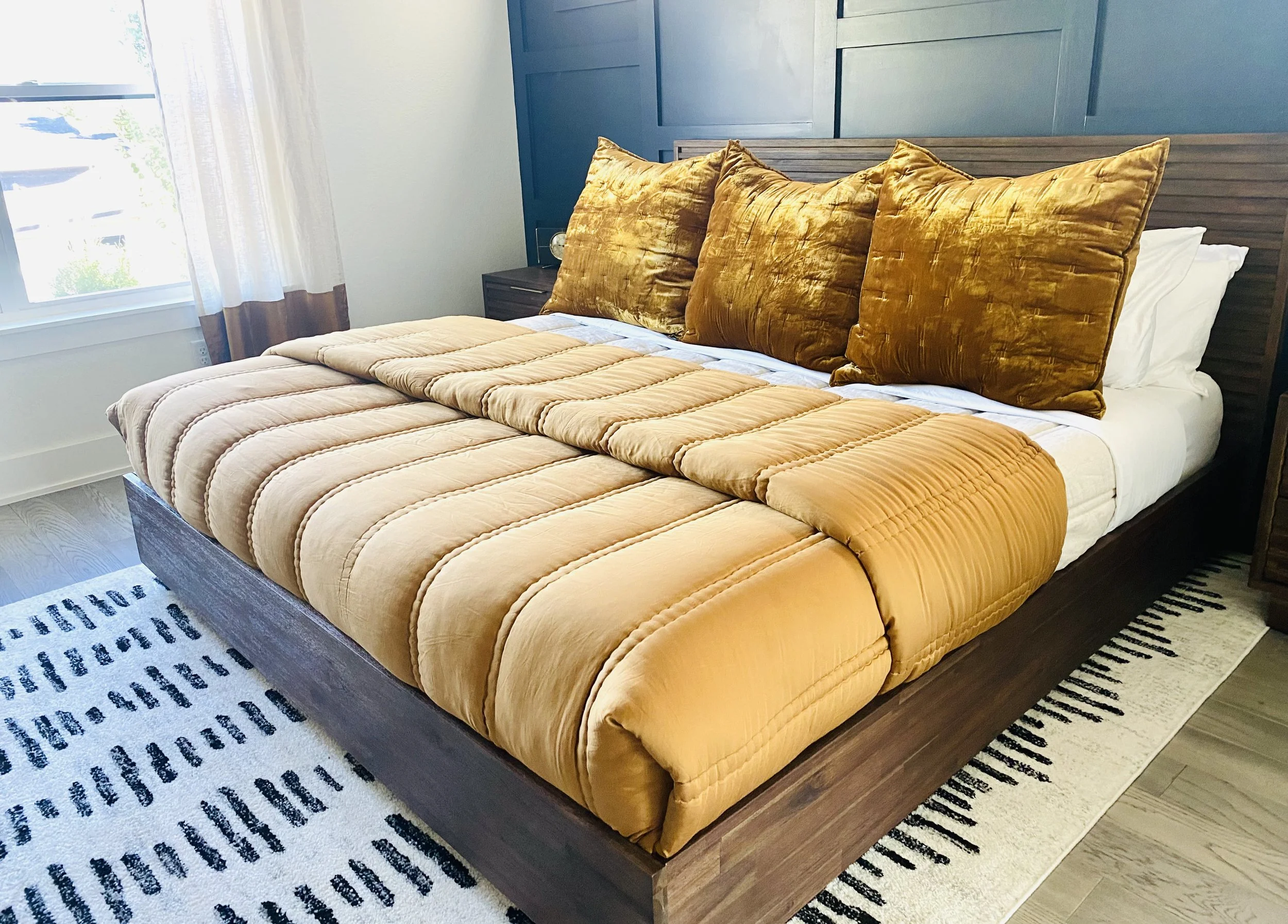A bedroom with a bed featuring a wooden frame, gold-colored pillows, a gold comforter, and a white sheet. There is a nightstand and a window with white and brown curtains, and a rug with black and white pattern.