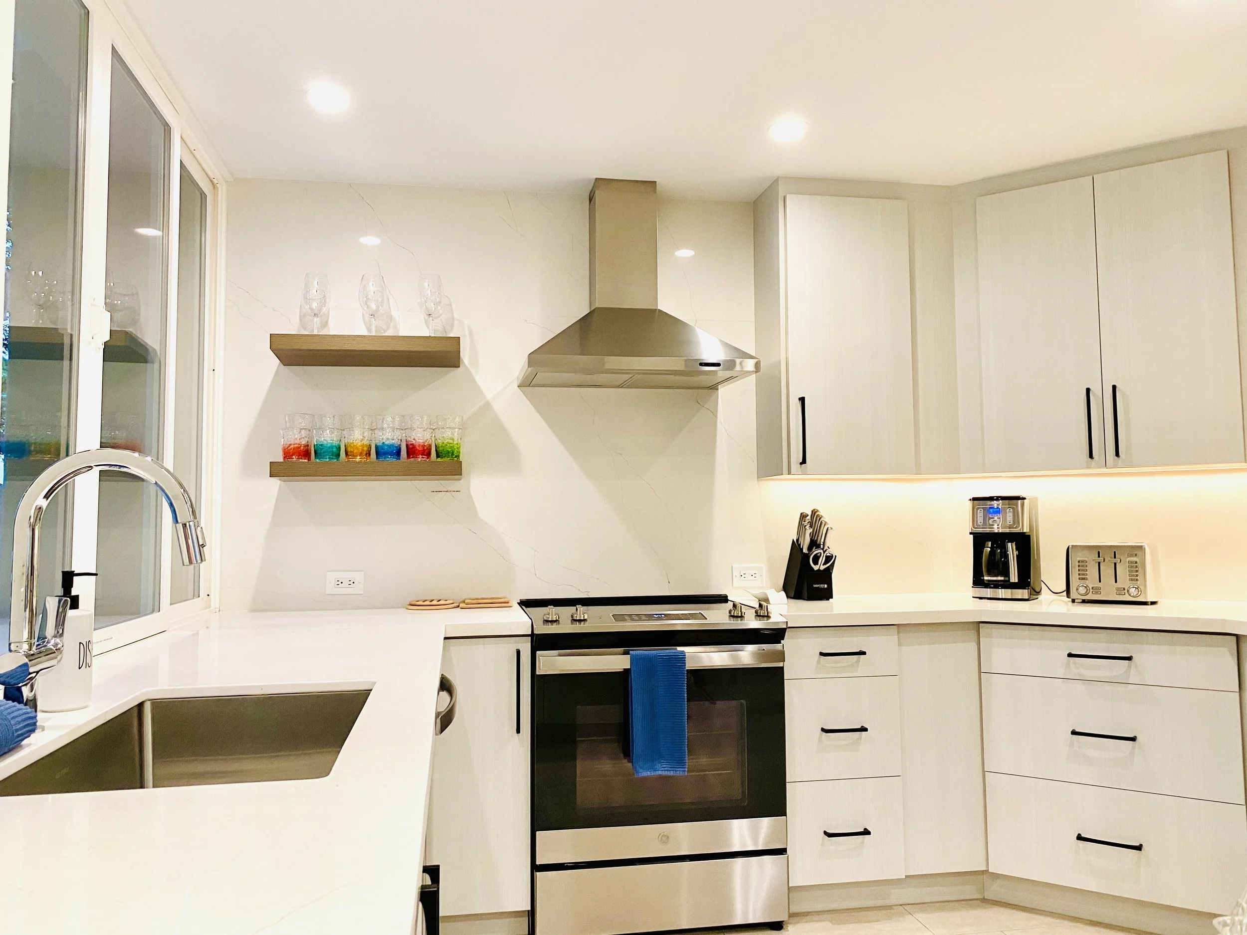 Modern kitchen with white cabinets, stainless steel oven and range hood, countertop with coffee maker, toaster, and knife block, and decorative glassware and colorful drinks on floating shelves.