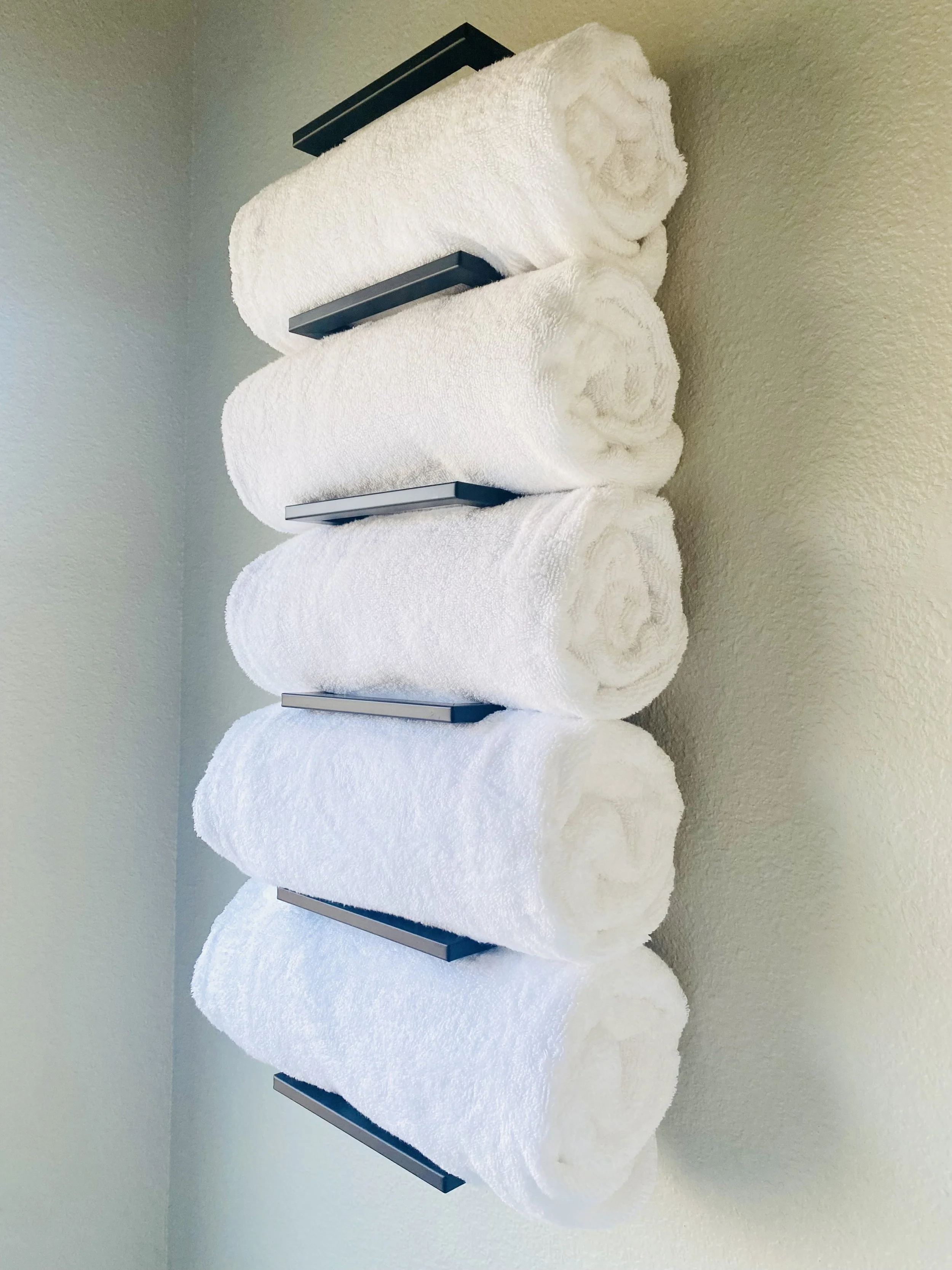 Five white rolled towels stacked vertically on black metal racks mounted on a beige wall.