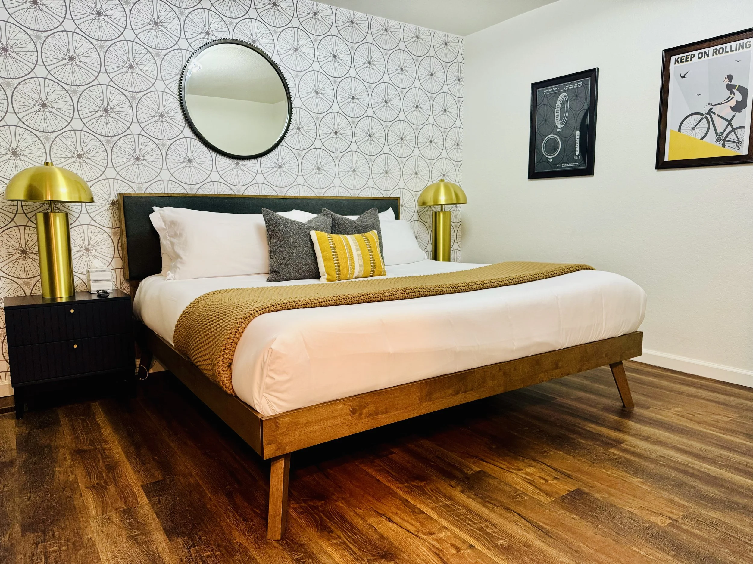 A modern bedroom with a wooden bed frame, white bedding, and multiple gray and yellow pillows. There are two golden bedside lamps, a round mirror, and three framed art pieces on the wall. The flooring is dark wood, and the wall behind the bed has pat