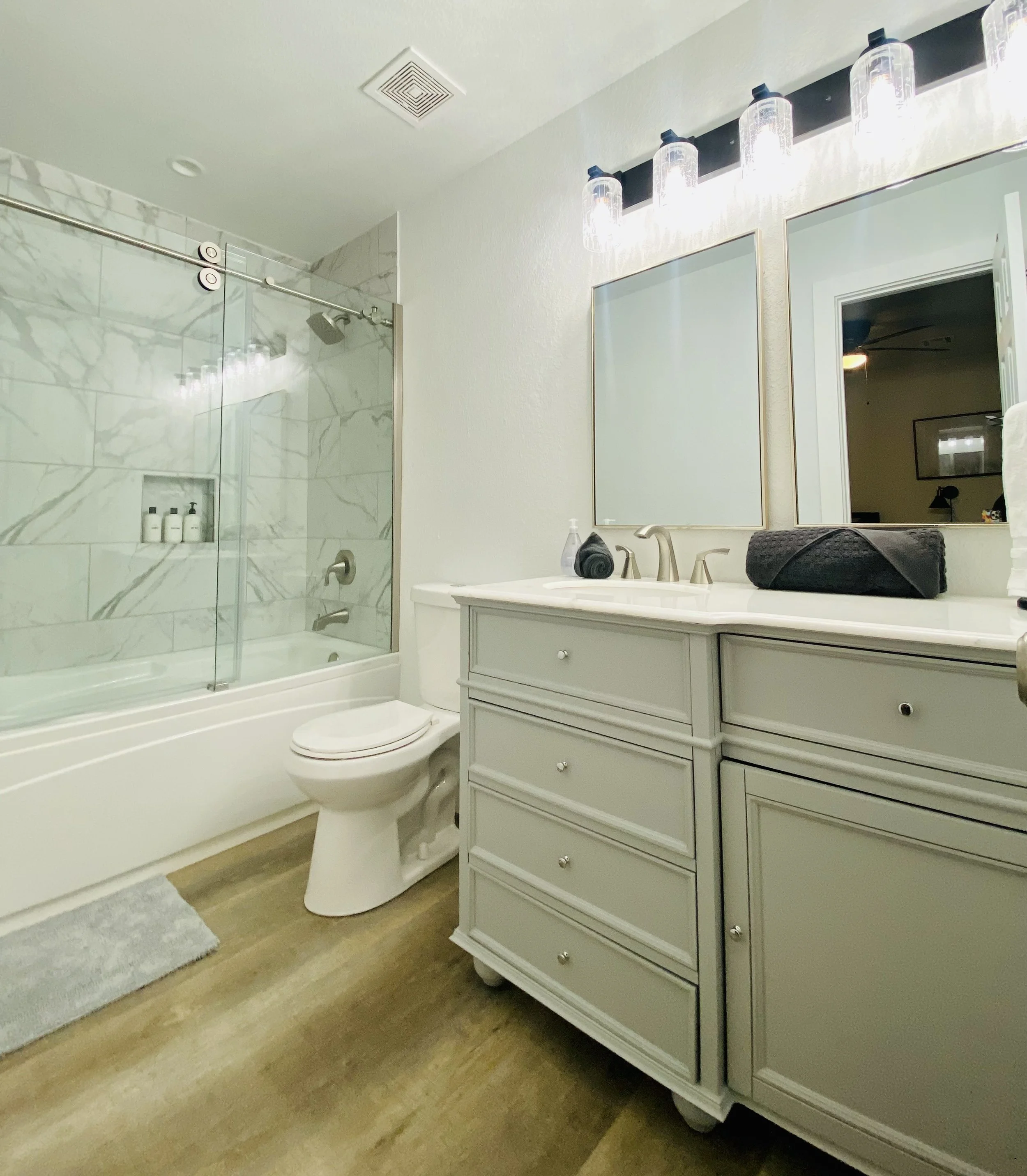 Modern bathroom with a bathtub and shower, a white toilet, and a vanity with a large mirror, soap dispenser, and rolled towel.