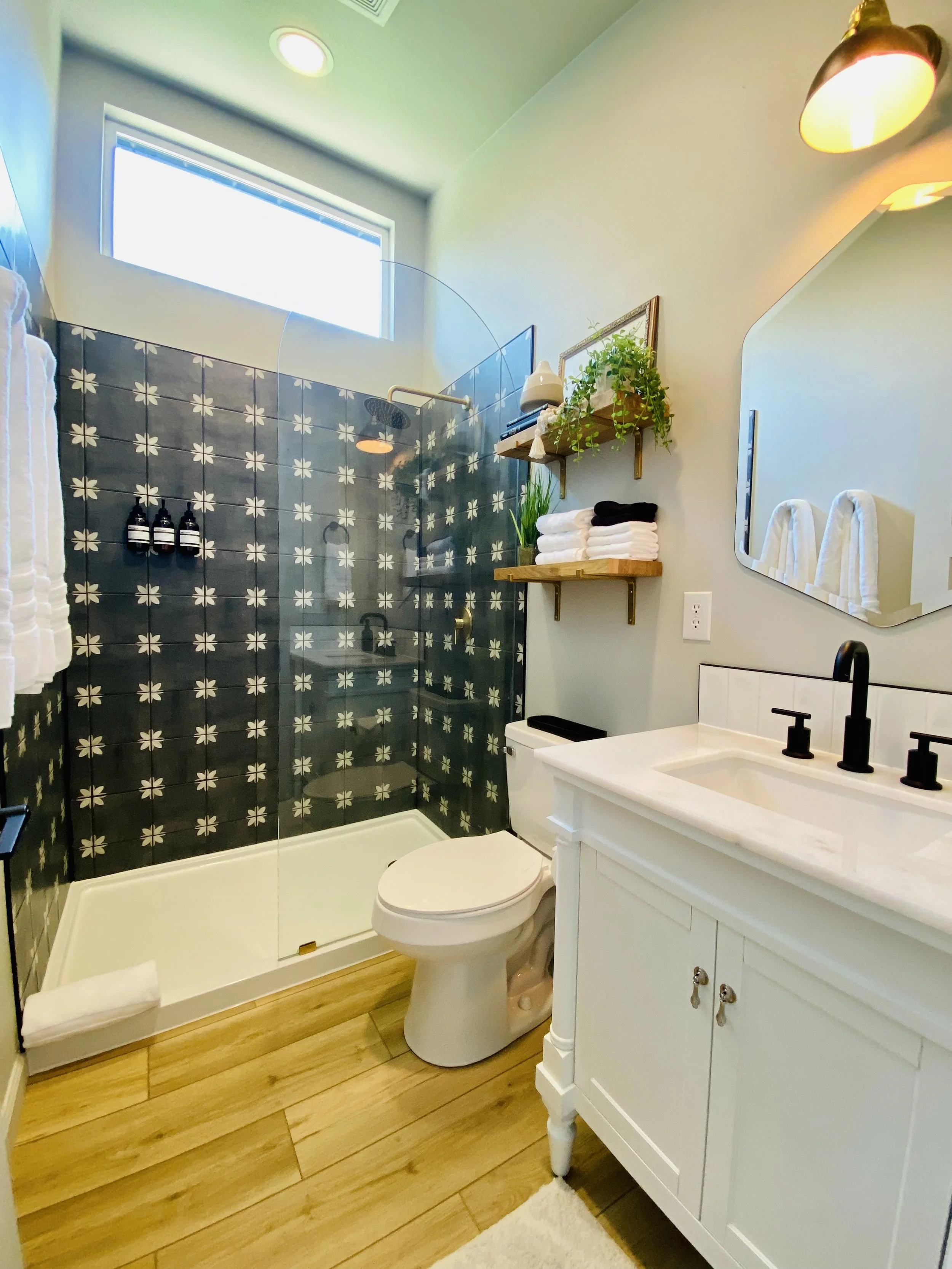 Bathroom with a walk-in shower with black tile featuring white flowers, a toilet, a white vanity with black fixtures, and wooden flooring. There are shelves with towels, a mirror, and a window above the shower.
