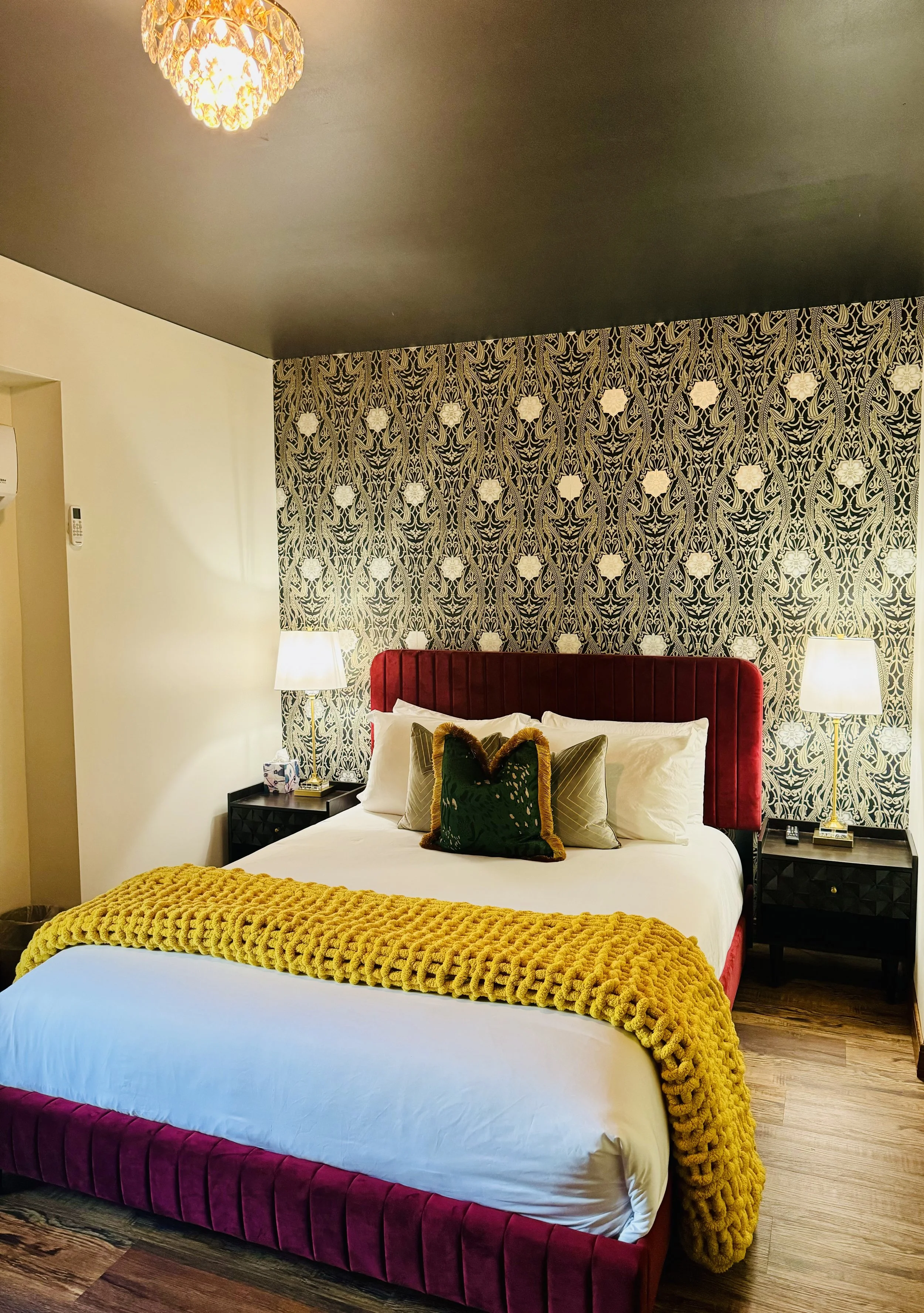 A bedroom with a red upholstered bed, decorative pillows, a yellow knitted throw blanket, black nightstands, and patterned wallpaper behind the headboard. There's a chandelier hanging from the ceiling and two table lamps on each side of the bed.