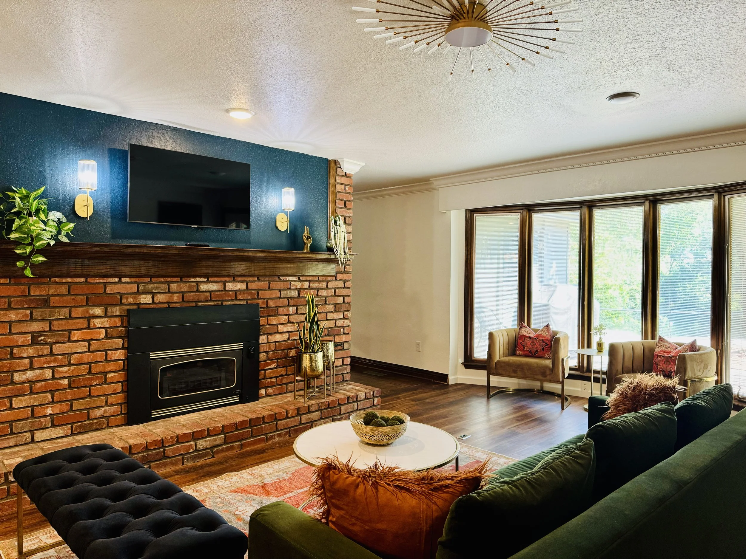 Living room with brick fireplace, dark green couch, two beige armchairs near large windows, and a modern chandelier.