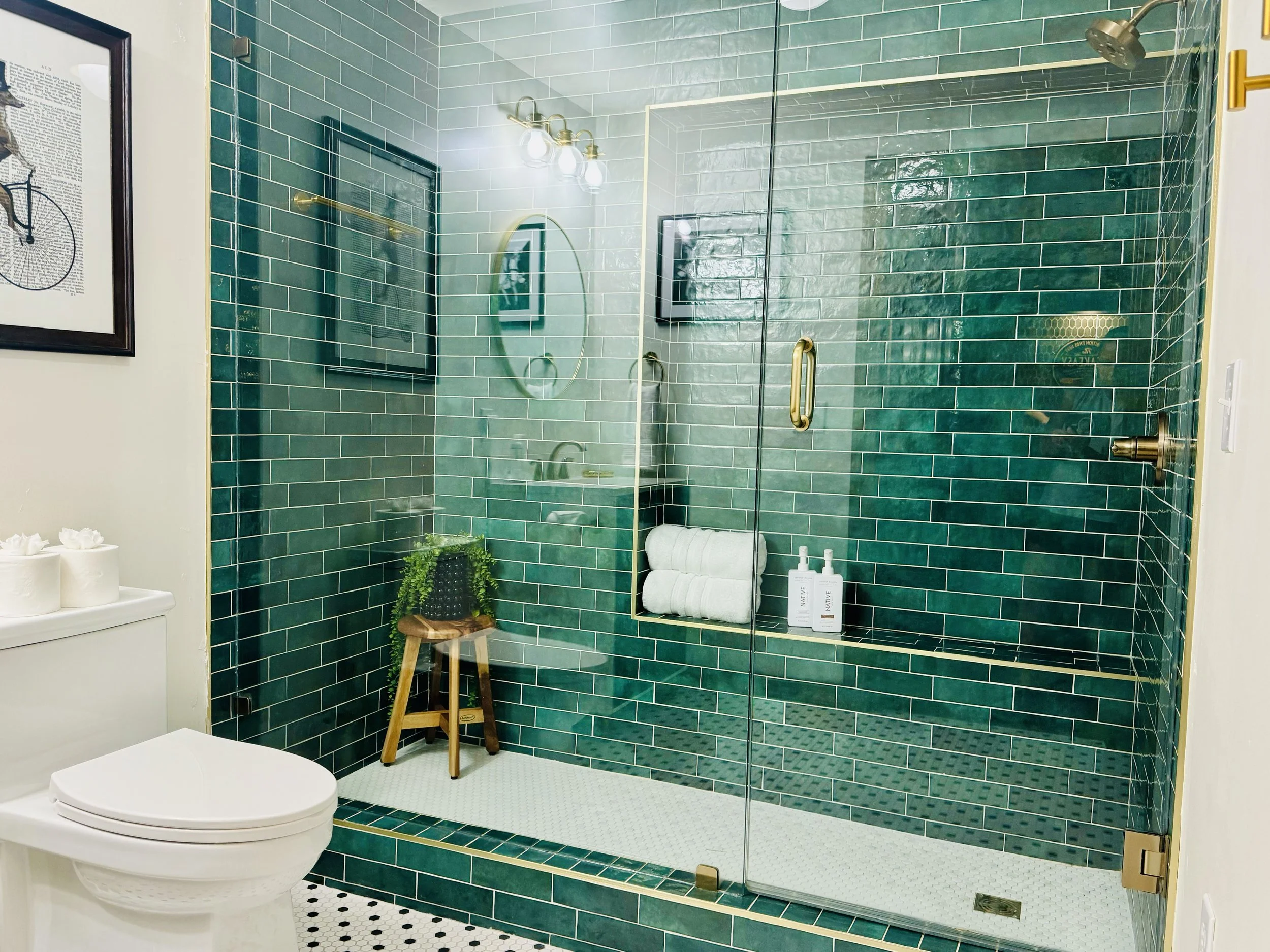 Bathroom with green tiled shower enclosure, glass door, and gold hardware; white toilet, framed art, and small stool with plants inside shower.