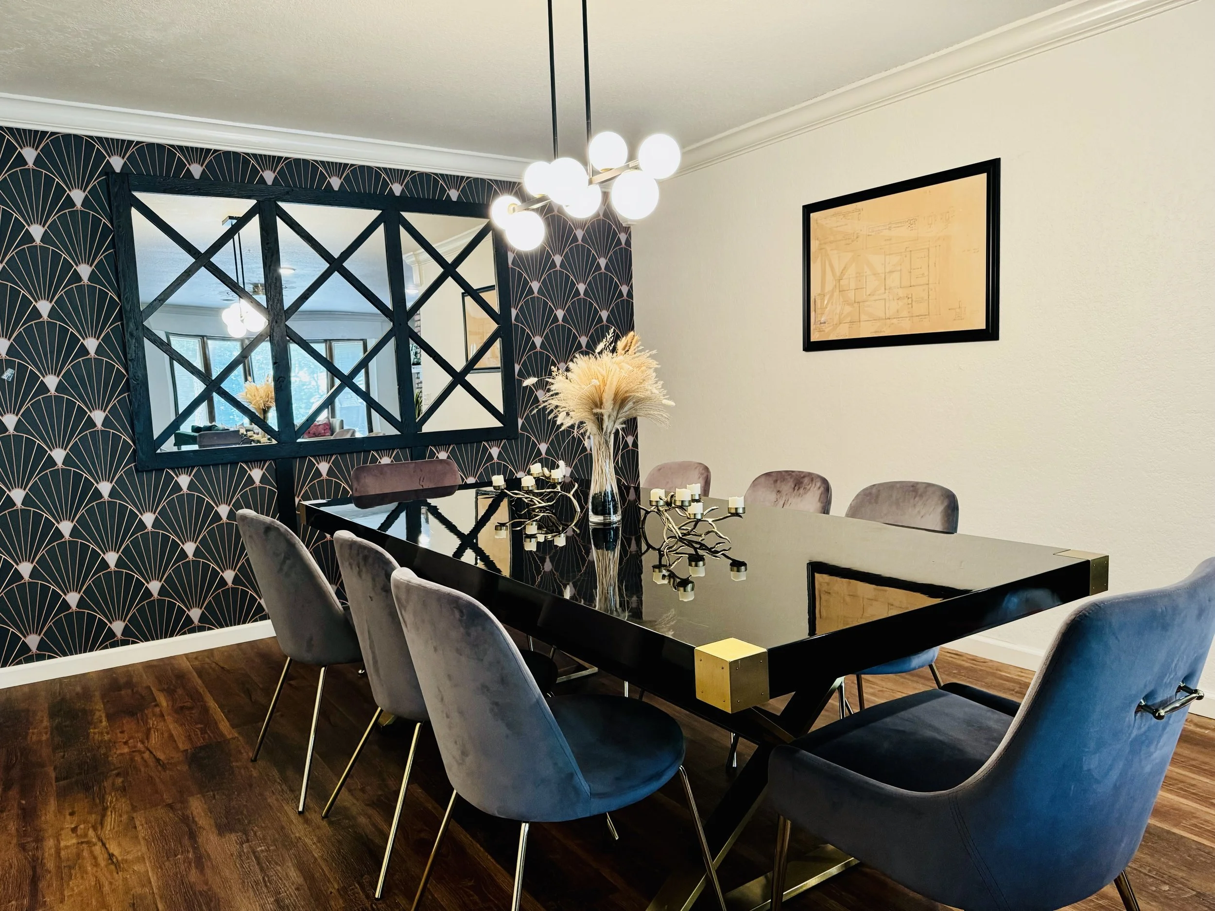 Modern dining room with black table, eight velvet chairs in shades of gray and purple, a decorative chandelier, and a wheat centerpiece. Dark patterned wallpaper on one wall, plain white on others, a framed wall art, and a large mirror reflecting par